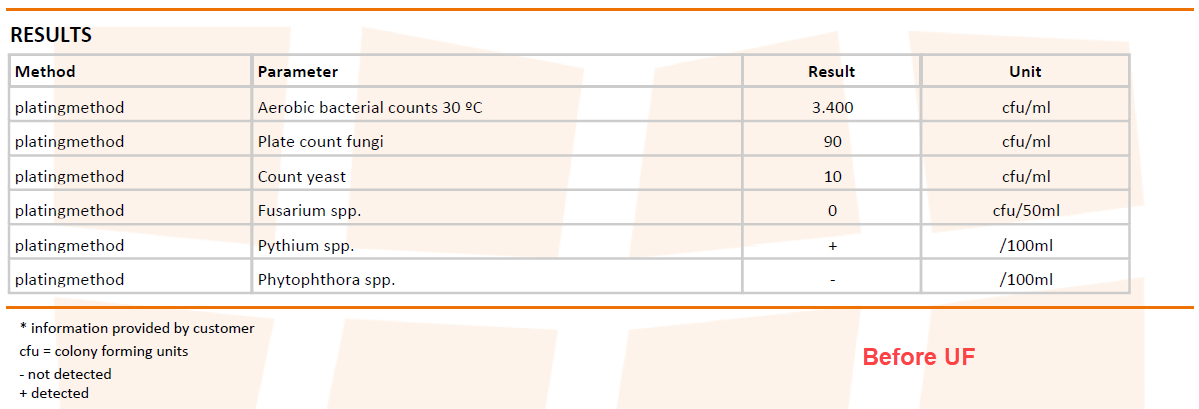 Ultrafiltration ist eine Technologie, die sich für die Aufbereitung vieler Wasserarten eignet, wie z. B. Oberflächenwasser, Flusswasser, Regenwasser und Rezirkulationswasser oder als Vorfiltration für eine Umkehrosmoseanlage. Es handelt sich um eine Desinfektionstechnik, die unempfindlich gegenüber der Lichtdurchlässigkeit (T10-Wert) des Wassers ist. Eisenanteile oder eine Verfärbung des Wassers durch CocoPeat stellen keine Einschränkung der Desinfektionsleistung mehr dar.